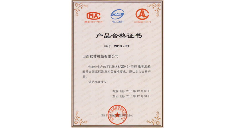 BY21型熱壓機、BY624×8/16、BY154×8/20(5)通過國家木工機械質量監督檢驗中心檢驗